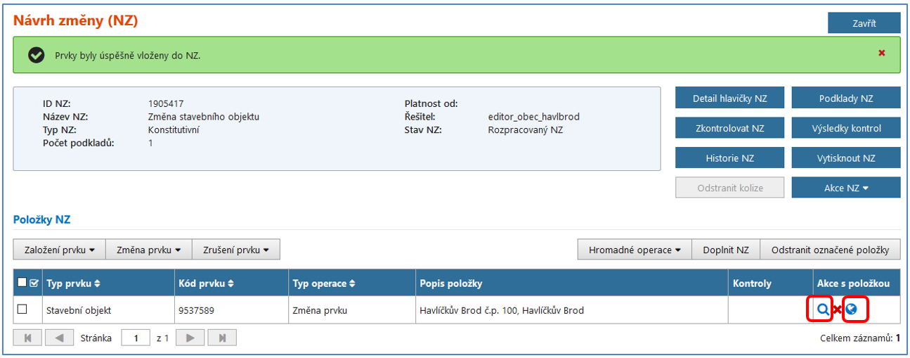 Po vybrání příslušného stavebního objektu Vás aplikace vrátí zpět do detailu NZ (obrazovka UNZ110), kde již máte vybraný stavební objekt zobrazený v položkách NZ. Nyní klikněte na ikonu glóbu/zeměkoule pro zobrazení grafického editoru pro změnu nebo doplnění definičního bodu a dále postupujte dle kapitoly Vkládání definičního bodu stavebního objektu v grafickém editoru a změňte/doplňte jeho polohu.
