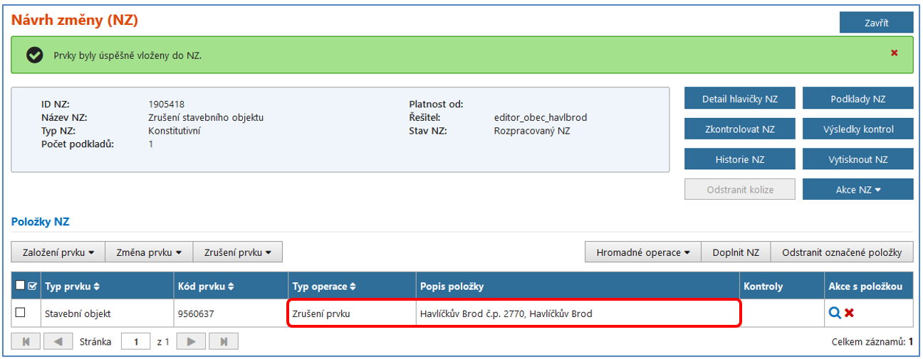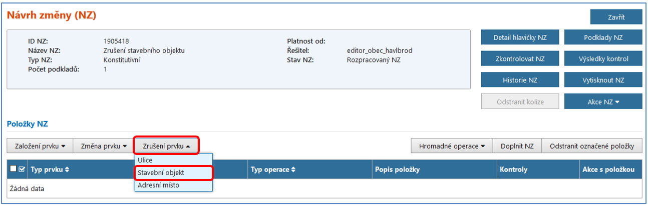 Pro zrušení adresního místa je možné použít funkci Doplnit NZ. V případě, že kliknete na tlačítko Doplnit NZ, budou do příslušného návrhu změny načtena všechna adresní místa všech rušených stavebních objektů z NZ s typem operace Zrušení prvku.