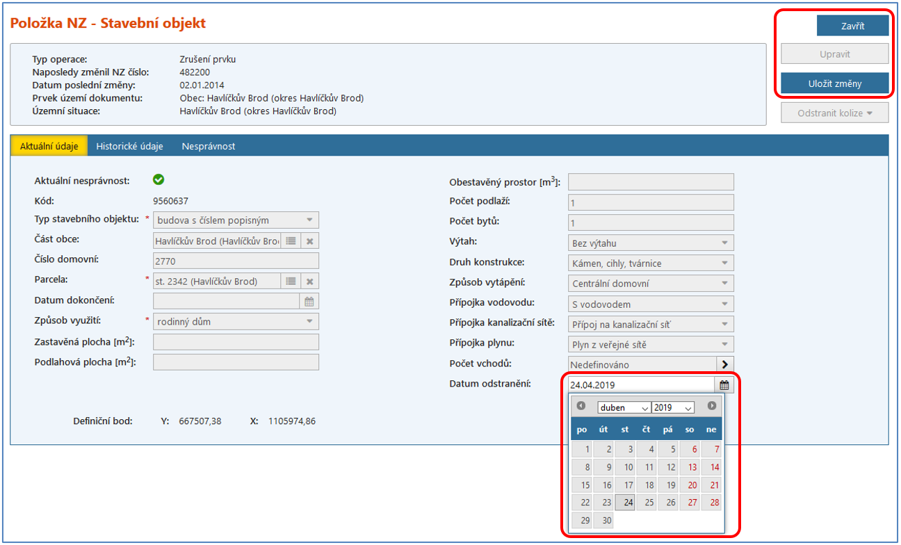 Jelikož rušíte stavební objekt, je nutné v detailu Položka NZ – Stavební objekt (obrazovka UNZ119) doplnit údaj Datum odstranění. Klikněte na ikonu lupy v příslušném řádku stavebního objektu v Položkách NZ, v detailu stavebního objektu klikněte na tlačítko Upravit a vyplňte údaj Datum odstranění, který je povinným parametrem pro umožnění zrušení stavebního objektu. Datum lze zadat ručně (ve formátu dd.mm.rrrr a nesmí být uvedena hodnota v budoucnosti) nebo pomocí kalendáře.