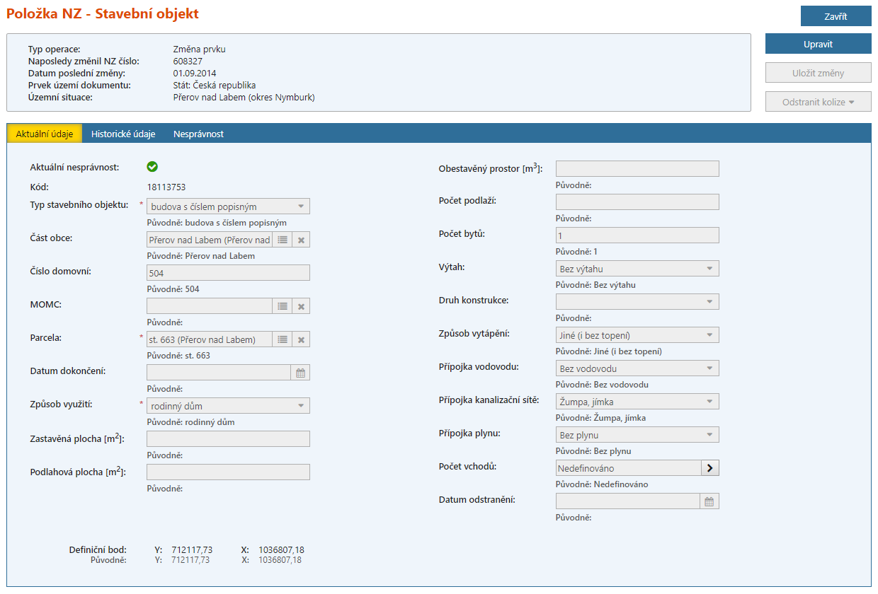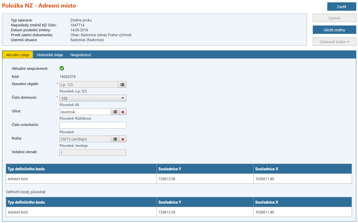V případě změny AM načteného v NZ se změna čísla domovního promítne automaticky, nicméně je potřeba změnu potvrdit kliknutím na tlačítko „Upravit“ a následně na „Uložit změny“. V případě, že se jedná o obec s uličním systémem, je také potřeba provést změnu údaje „ulice“.
