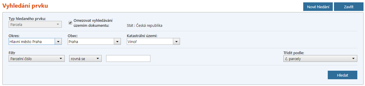 Před výběrem části obce a parcely v sousední obci je nezbytné odznačit „Omezení vyhledávání územím dokumentu“ viz následující obrázek.