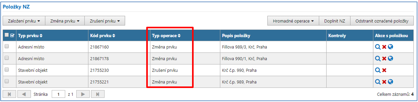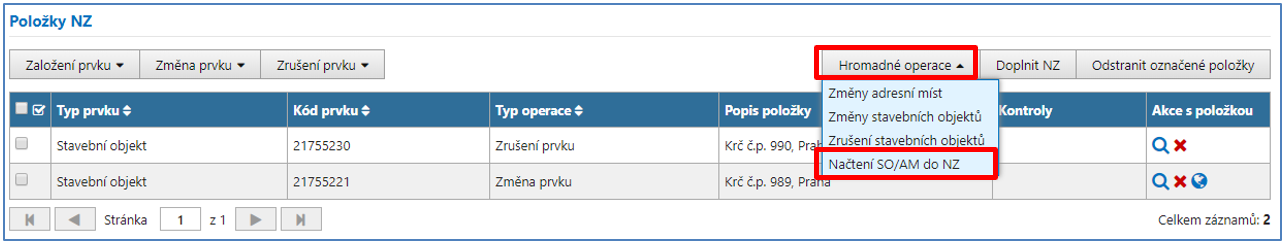 Stavební objekt (SO) s nejnižším číslem domovním bude zachován a budete provádět jeho změnu (Typ operace: Změna prvku). Další stavební objekt/y bude/ou zrušen/y (Typ operace: Zrušení prvku). Příslušná adresní místa všech dotčených stavebních objektů je nutné zachovat – načtěte je pro změnu (Typ operace: Změna prvku). Doporučujeme využít funkci z Hromadných operací (Načtení SO/AM do NZ), která ke stavebním objektům v NZ automaticky načte jejich adresní místa pro změnu.