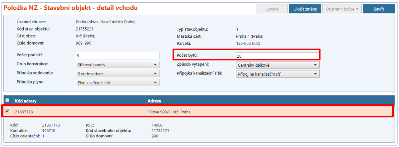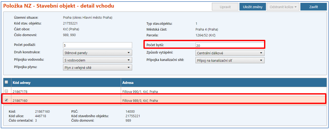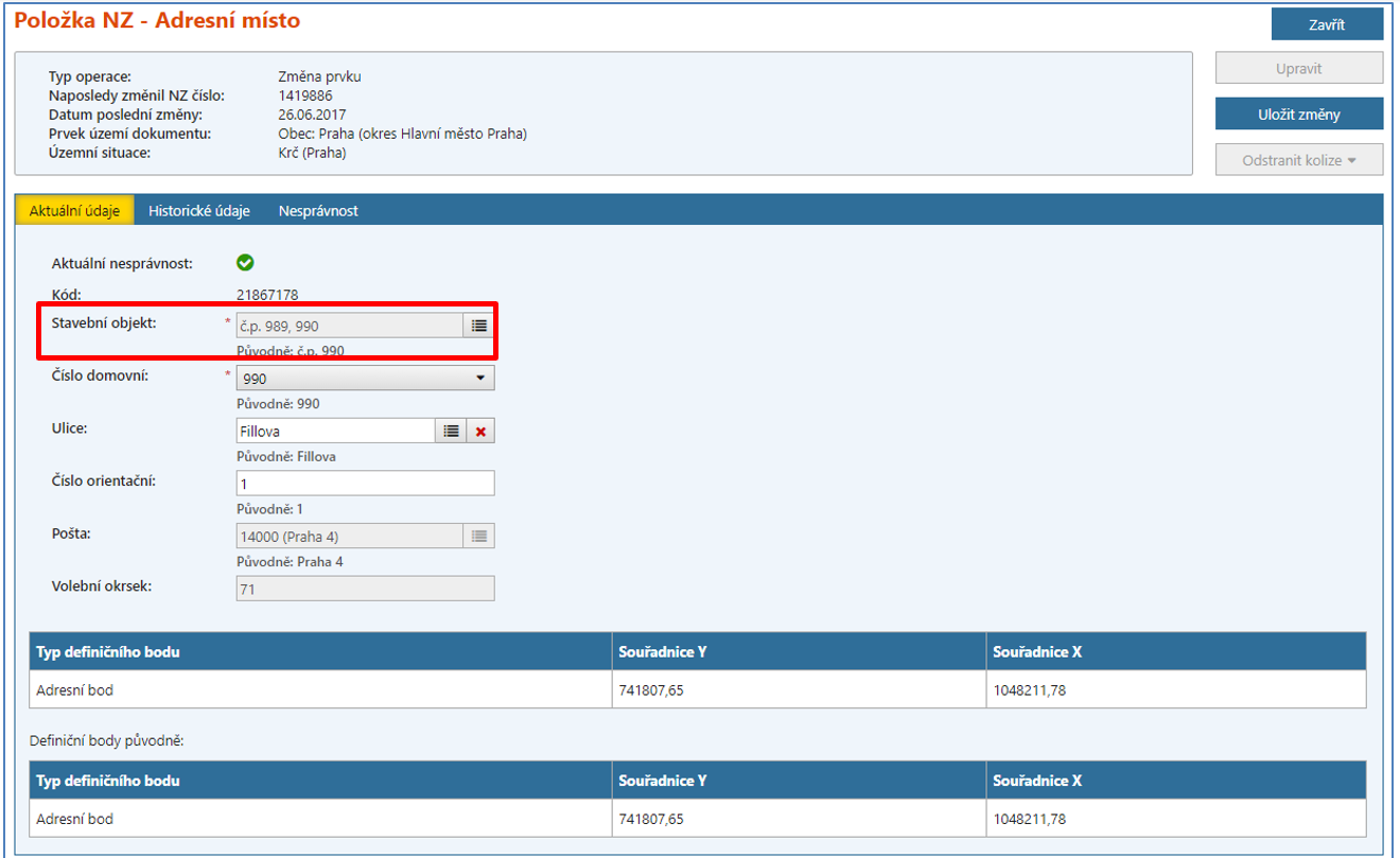 Adresní místo č. p. 990 musí být zachováno, a proto v jeho detailu změňte vazbu na měněný stavební objekt č. p. 989,990 (vyhledat stavební objekt přes ikonu