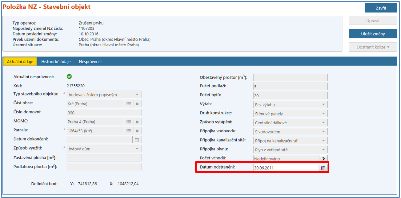 V detailu rušeného SO s č. p. 990 doplňte Datum odstranění 30. 6. 2011 (datum úvodní migrace dat do RÚIAN).