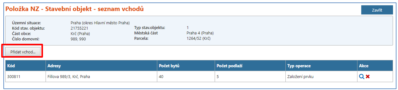 V detailu SO klikněte na tlačítko „Vchody“, následně na tlačítko „Přidat vchod“. Údaje v jednotlivých kolonkách zadejte podle podkladů tak, aby korespondovaly s údaji uvedenými v detailu SO, viz následující pravidla.
