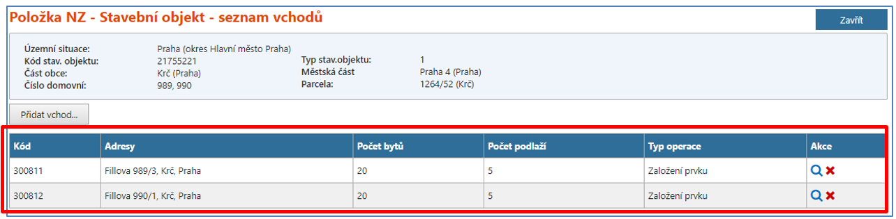 Nyní již jsou definovány dva vchody. Každý vchod má své adresní místo: