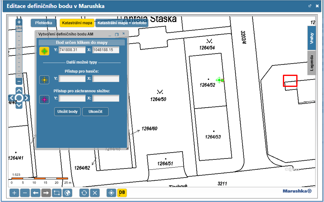 Posledním krokem je kontrola a případná oprava definičních bodů prvků. Stavební objekty by měly mít lokalizaci v těžišti SO. Definiční body adresních míst umístěte na příslušné vstupy do budovy: