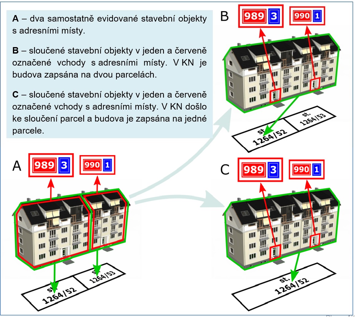 Příčinou sloučení číslovaných stavebních objektů může být např. provedení stavebních úprav nebo chybný zápis stavebních objektů v RÚIAN (viz. Aplikace na kontroly dat RÚIAN) nebo porovnání budov z Registru sčítacích obvodů a budov od Českého statistického úřadu).