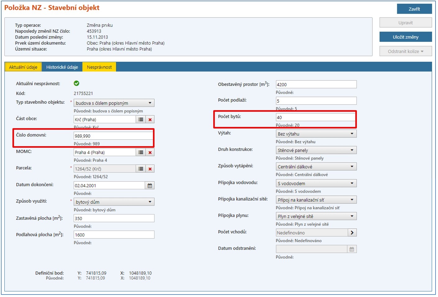 Změna SO spočívá v úpravě čísla domovního na „989,990“ a v doplnění/opravě ostatních údajů vedených o SO – např. technickoekonomických atributů: zastavěná plocha, podlahová plocha nebo počet bytů (tyto údaje by měly mít vyšší hodnotu, jelikož nově zahrnují také rušený SO, který slučujete):