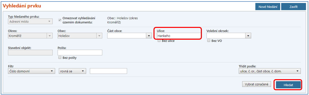 Otevře se vyhledávací formulář, ve kterém je potřeba vyhledat adresní místa, u kterých se bude měnit vazba na ulici. V našem případě se jedná o adresní místa, která mají momentálně přiřazenou ulici Hankeho, proto v Kritériích vyhledání vyplňte pouze pole Ulice a klikněte na tlačítko Hledat. Vyhledají se všechna adresní místa ve zvolené ulici.
