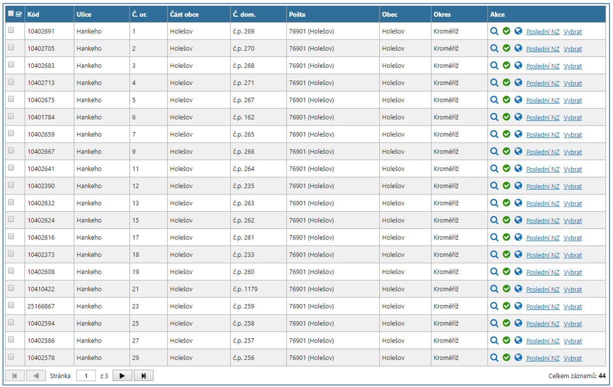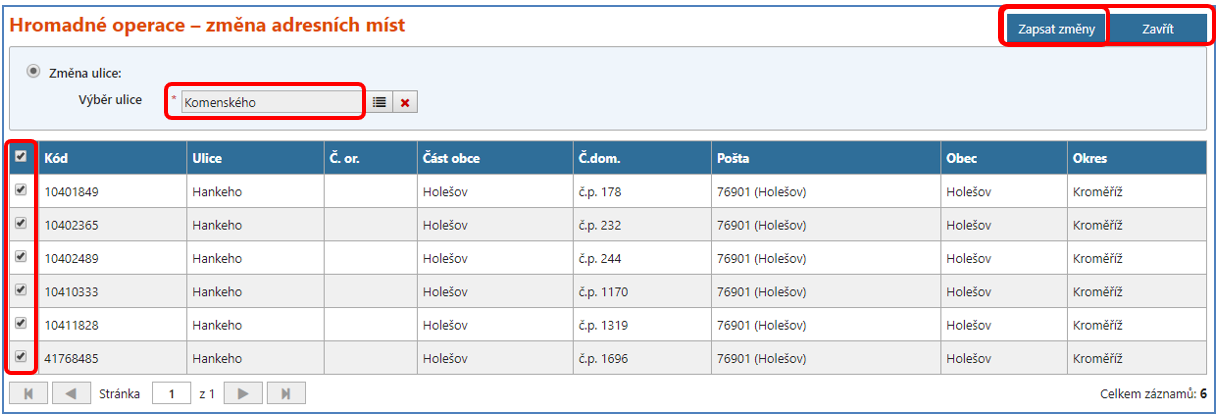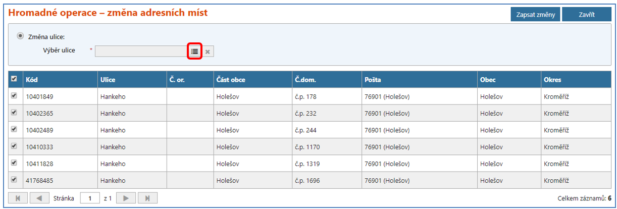 Z vyhledaných prvků zaškrtněte příslušné řádky adresních míst, která chcete měnit. Při zaškrtávání je možné v seznamu vyhledaných prvků listovat mezi jednotlivými stránkami a označení prvků bude zachováno.