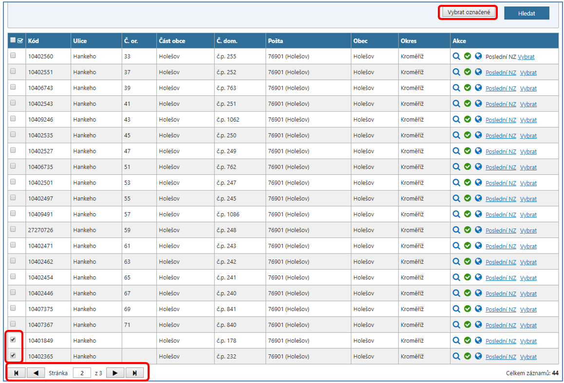 Po označení všech požadovaných adresních míst klikněte na tlačítko Vybrat označené pro jejich načtení do NZ.