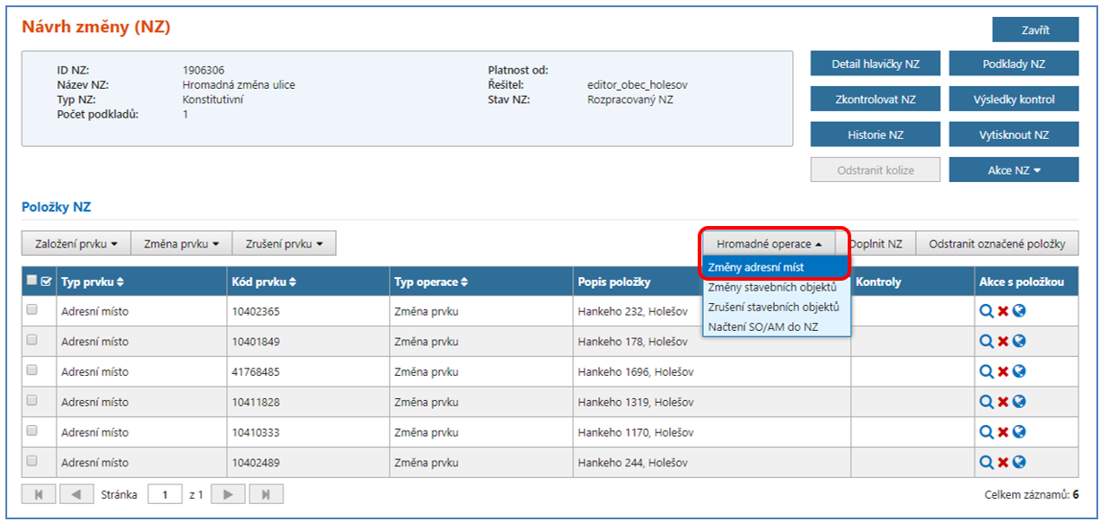Nacházíte se v detailu NZ, kde máte načtena adresní místa, u kterých je potřeba změnit vazbu na ulici. Abyste nemuseli změnu provádět pro každé adresní místo zvlášť, použijte novou funkci Hromadné operace -> Změny adresních míst.