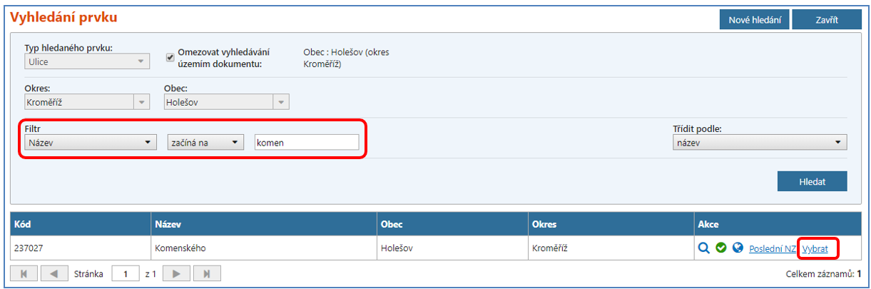 Aplikace vás odkáže do vyhledávacího formuláře. Příslušnou ulici vyhledáte např. zadáním počátečních písmen do filtru Název začíná na a kliknutím na tlačítko Hledat. Konkrétní ulici zvolíte odkazem Vybrat na příslušném řádku.
