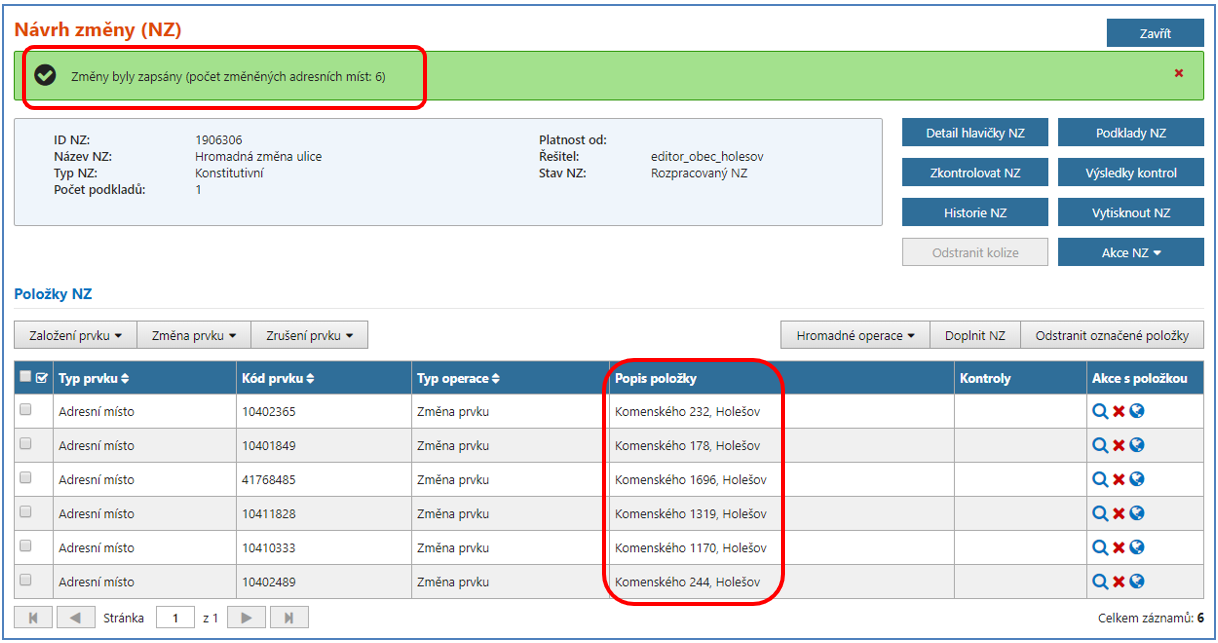 V horní části obrazovky se vypíše informace o počtu změněných adresních míst. Změnu je možné si ověřit ve sloupci Popis položky, kde již je u příslušných adresních míst zapsána nová ulice.