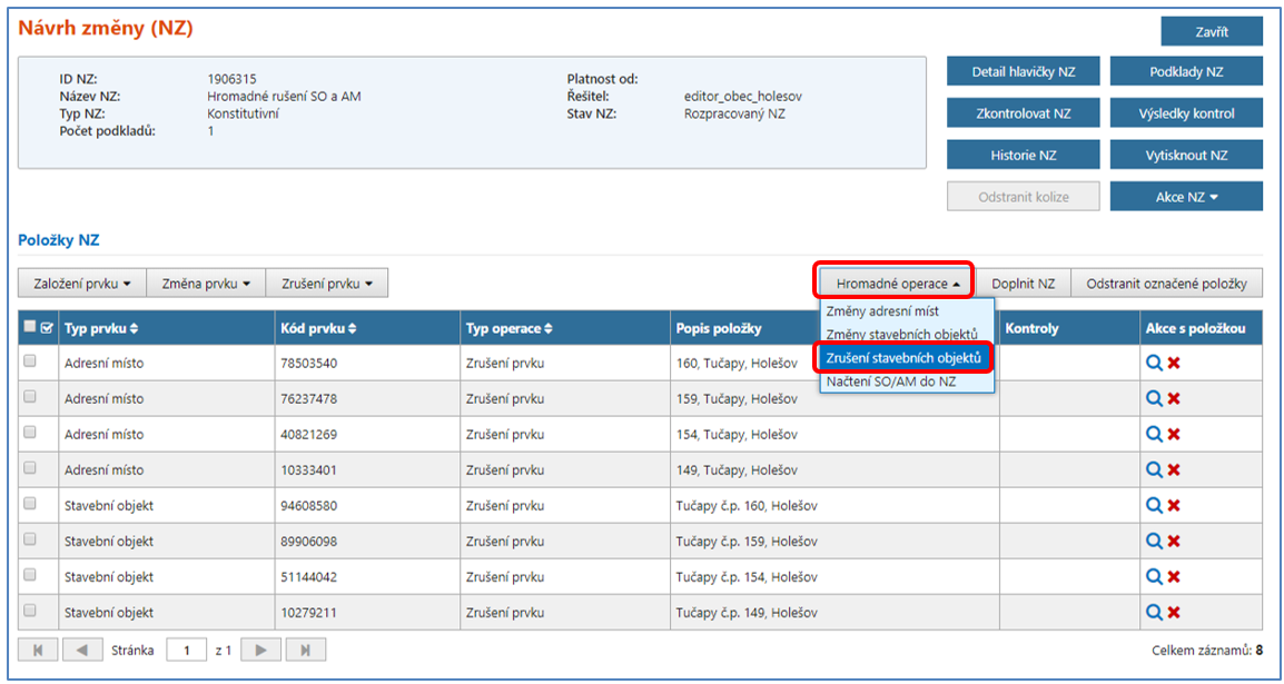 Nyní už v NZ máte načtené stavební objekty i jejich adresní místa ke zrušení. Pro zadání data odstranění u všech stavebních objektů najednou použijte funkci Hromadné operace -> Zrušení stavebních objektů.