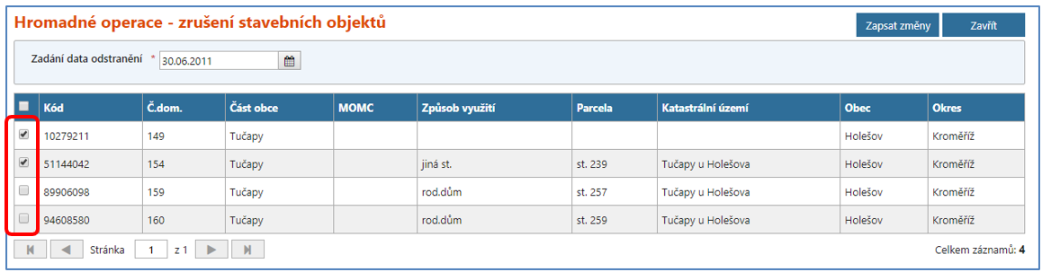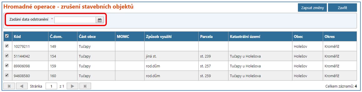 Při použití hromadného zadání data odstranění u rušení stavebních objektů bez čísla domovního je postup shodný, s výjimkou toho, že se nenačítají ke zrušení (případně ke změně) adresní místa, jelikož žádná nemají.