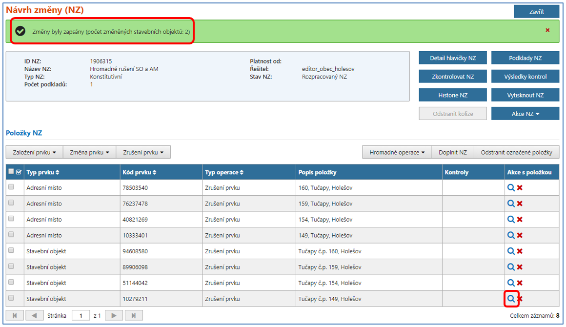 O úspěšném zapsání údaje je uživatel informován systémovým hlášením v horní části obrazovky a provedené doplnění údaje si můžete zkontrolovat v detailu příslušných stavebních objektů (ikona lupy).