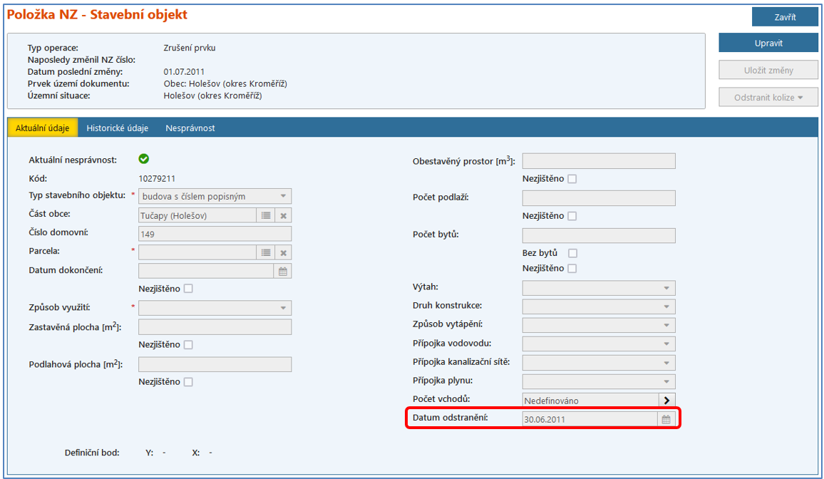 V situaci, kdy potřebujete zrušit více stavebních objektů pro jejich neexistenci (zejména při řešení nesouladů z kontrolních sestav v Aplikaci pro kontrolu dat RÚIAN – například řešení duplicitních stavů SO), je potřeba zadat datum odstranění v detailu rušeného stavebního objektu.