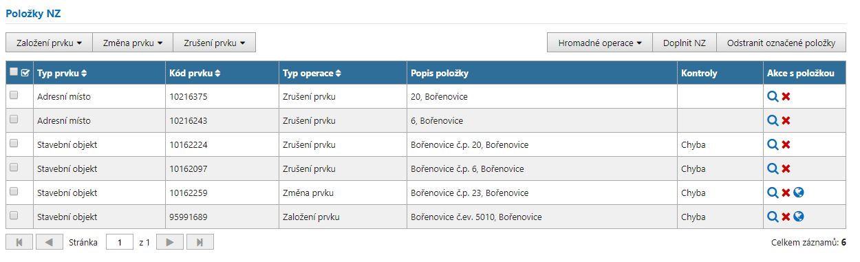 Informace o chybě nebo varování je zároveň uvedena i u příslušných prvků v Položkách NZ a to ve sloupci Kontroly textem „Chyba“ nebo „Varování“. Tento údaj se aktualizuje až při dalším spuštění kontrol.