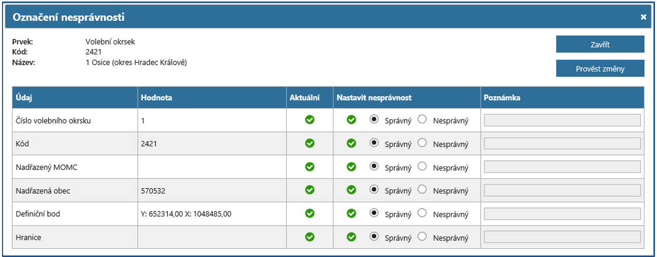 Detailněji se nesprávnosti věnuje dokument Označování nesprávnosti volebních okrsků. Obecně označování nesprávnosti u prvků v ISÚI je popsáno v dokumentu Označování nesprávnosti.
