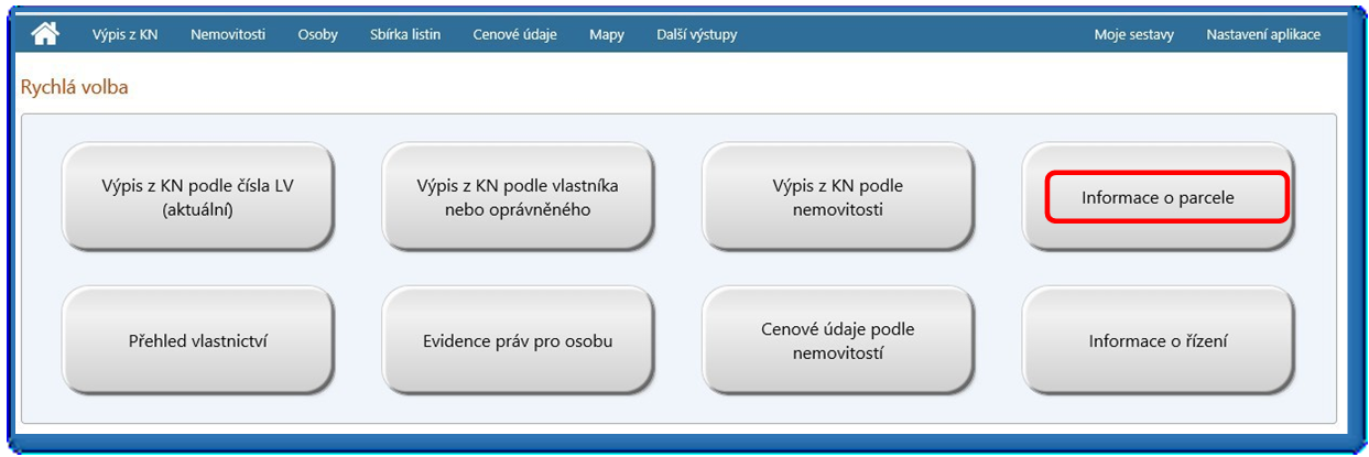 Po přihlášení se zobrazí úvodní obrazovka (viz obr. 1). Použijte tlačítko „Informace o parcele“.
