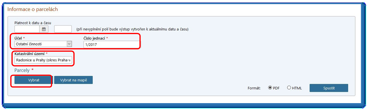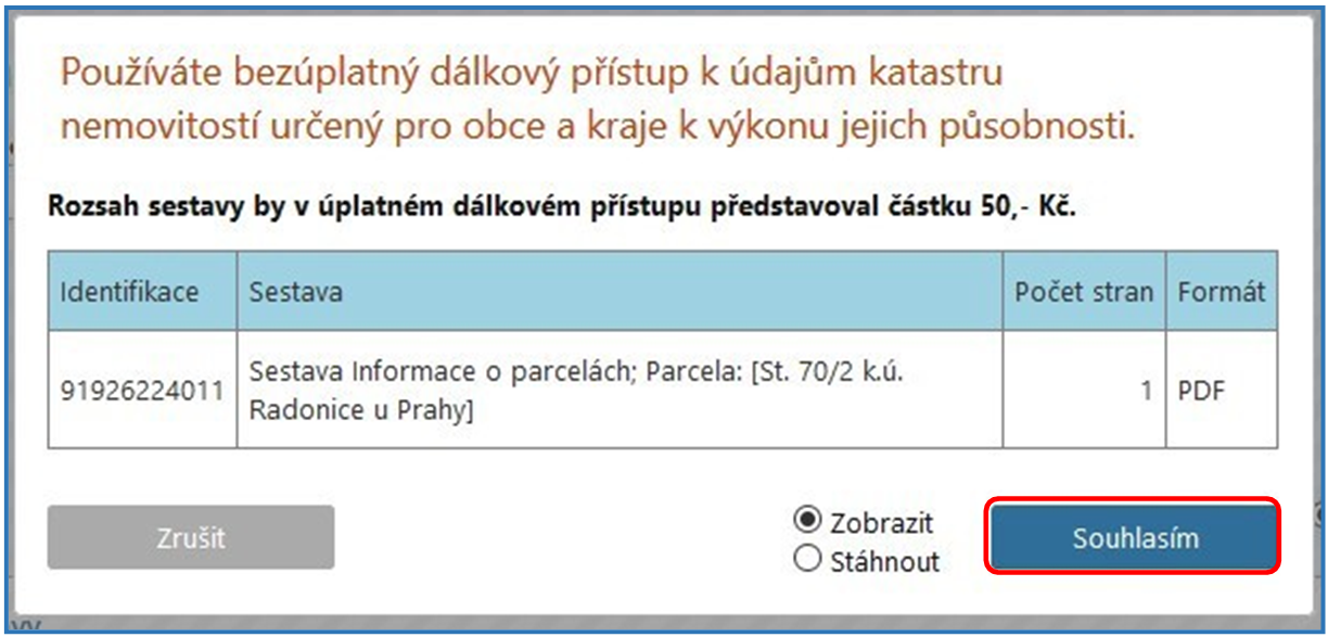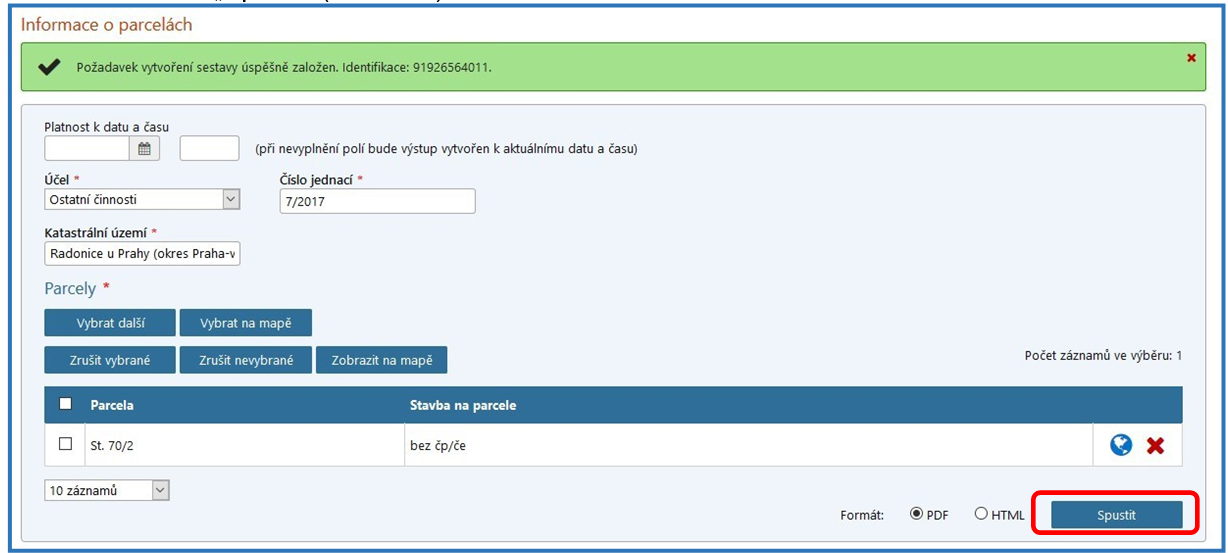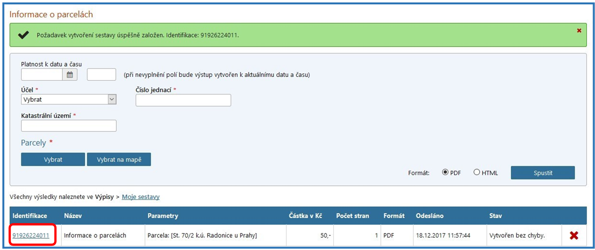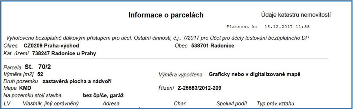 Následně se ve formátu PDF zobrazí sestava s názvem „Informace o parcelách“, ze které lze vyčíst mimo jiné číslo řízení („V“ nebo „Z“), v rámci kterého byl proveden zápis do katastru nemovitostí. Uvedené číslo řízení je označeno ve formátu: „Typ řízení-číslo řízení/rok-kód katastrálního pracoviště“ (např. V-1234/2017-123).