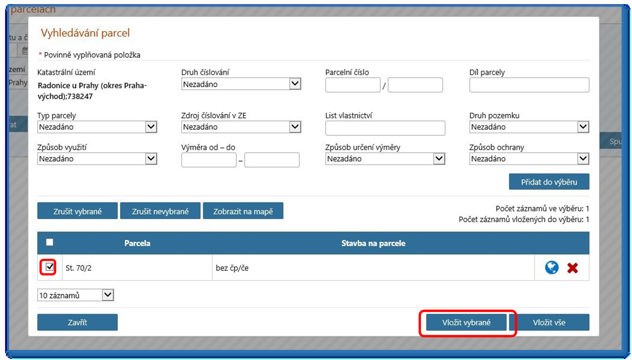 Zaškrtněte vyhledanou/požadovanou parcelu a stiskněte tlačítko „Vložit vybrané“.