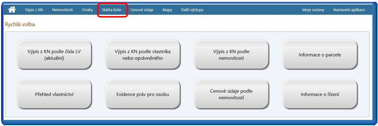 Obr. 9: Umístění sbírky listin na úvodní stránce DP