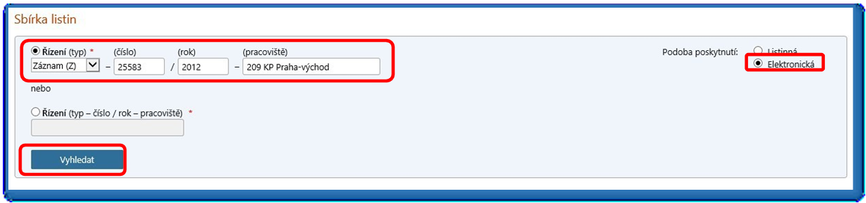 Po využití volby „Sbírka listin“ vyplňte povinně vyplňované položky typu řízení („V“ nebo „Z“), zvolte elektronickou podobu poskytnutí a stiskněte tlačítko „Vyhledat“ (viz obr. 10).
