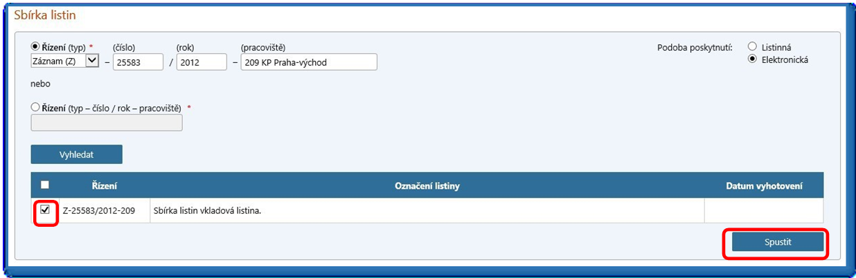 Následně se zobrazí listiny, které jsou v rámci příslušného čísla řízení zařazeny do sbírky listin katastru nemovitostí. Vyberte vámi požadovanou listinu a zvolte „Spustit“ (viz obr. 11).