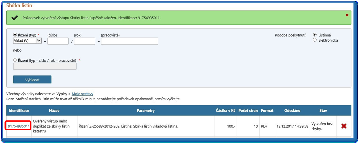 Založí se požadavek vytvoření výstupu. Pro zobrazení konkrétních listin zvolte volbu „Identifikace“ (viz obr. 12). Následně je nutné opět odsouhlasit použití DP (viz obr. 7 výše). Účtované částky jsou registrovány, avšak nefakturují se. Po odsouhlasení se zobrazí listiny ve formátu *.pdf.