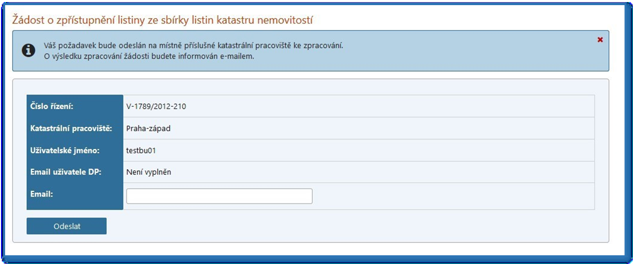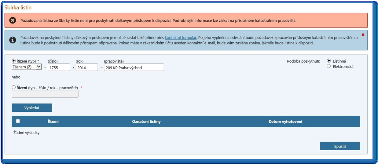 Ne všechny požadované listiny ze Sbírky listin jsou pro poskytnutí dálkovým přístupem k dispozici (viz obr. 13). Požadavek na poskytnutí listiny dálkovým přístupem je v takovém případě možné zaslat přes kontaktní formulář. Po jeho vyplnění a odeslání bude požadavek zpracován příslušným katastrálním pracovištěm a listina bude k poskytnutí dálkovým přístupem připravena. Pokud má uživatel v zákaznickém účtu uveden kontaktní e-mail, bude mu zaslána zpráva, jakmile bude listina k dispozici. Pokud uživatel v zákaznickém účtu nemá uveden kontaktní e-mail, může ho vyplnit ve formuláři před odesláním na místně příslušné katastrální pracoviště (viz obr. 14)