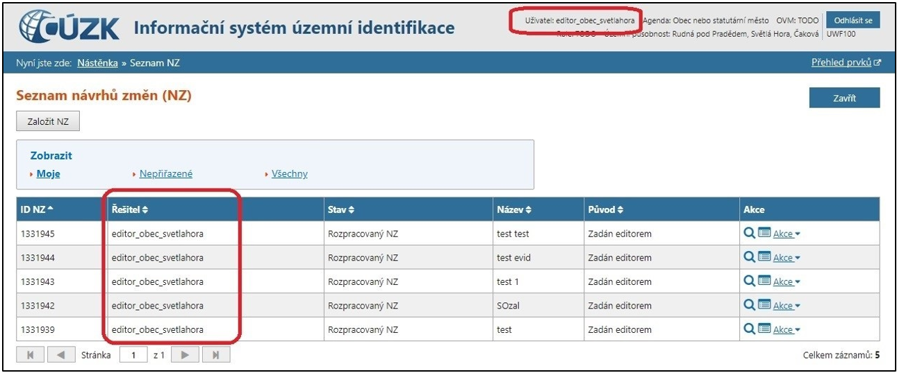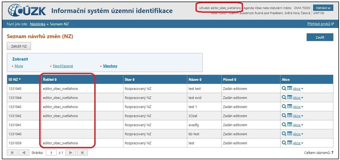Ve sloupci Řešitel uvidíte jméno uživatele, kterému je NZ přiřazen.