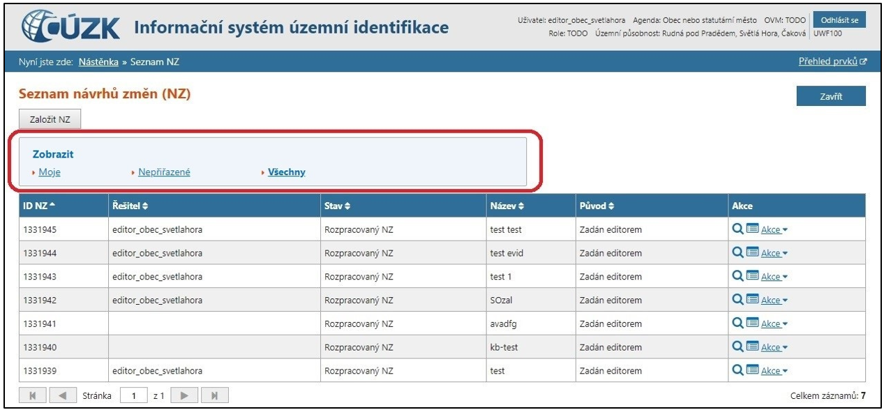 •Přepněte filtr návrhů změn – klikněte postupně na Moje, Nepřiřazené, Všechny.