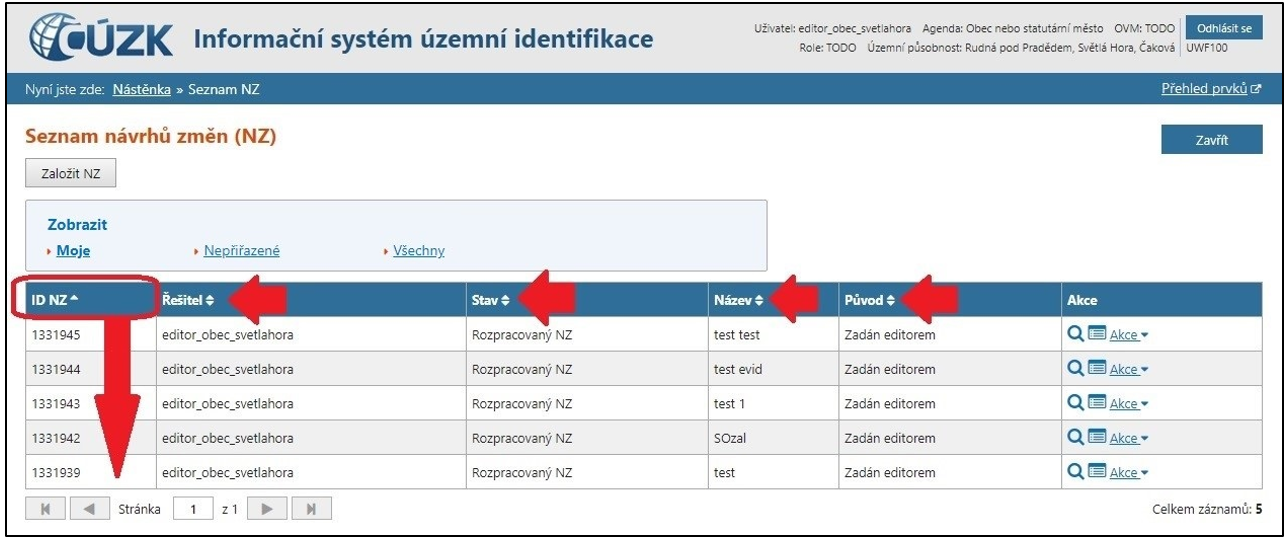 Seznam je možné filtrovat podle řešitele, třídit podle ID, řešitele, stavu NZ nebo názvu. Je také možné přejít na detail konkrétního návrhu nebo provádět akce s návrhem změny. Dále je zde možné založit nový návrh změny.