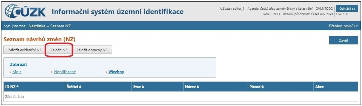 Uživatelé agendy ČÚZK mohou založit tři typy NZ: Evidenční NZ, Konstitutivní NZ a Opravný NZ viz kap. Návrh změny (NZ). Uživatelům z agendy Obec a SÚ se zobrazí pouze možnost založit Konstitutivní NZ (tlačítko Založit NZ). Uživatelům agendy Starosta umožní aplikace založit pouze speciální typ NZ: NZ VO. Tento scénář v následujících krocích popisuje založení a zpracování Konstitutivního NZ.