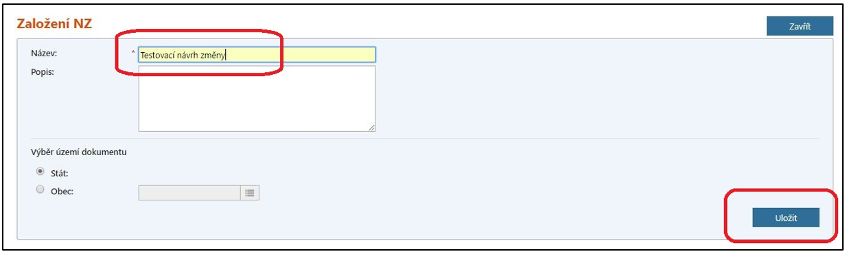 •Vyplňte název návrhu změny a potvrďte tlačítkem Uložit (obrazovka UNZ130).