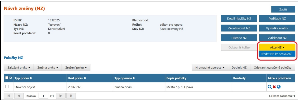 Klikněte na tlačítko Akce NZ > Předat NZ ke schválení (obrazovka UNZ110).