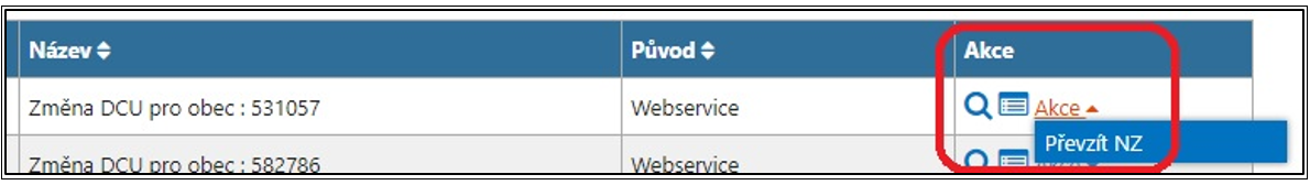 •V nabídce Akce v řádku příslušného návrhu změny klikněte na Převzít NZ.