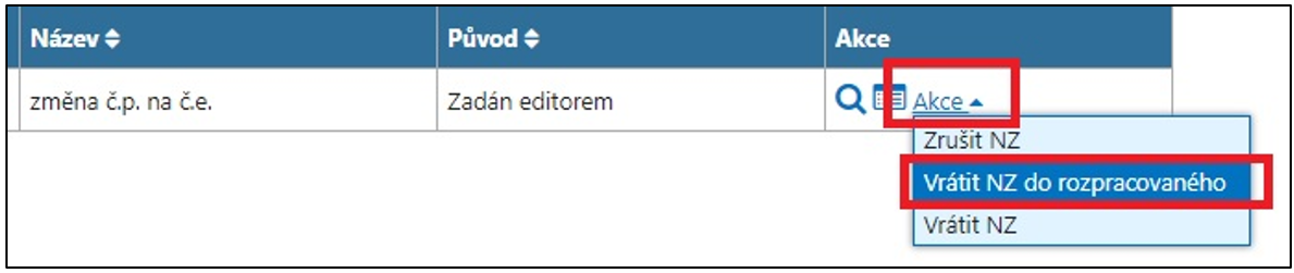 •Klikněte na filtr Moje a najděte v seznamu převzatý dokument. V nabídce Akce zvolte Vrátit NZ do rozpracovaného.