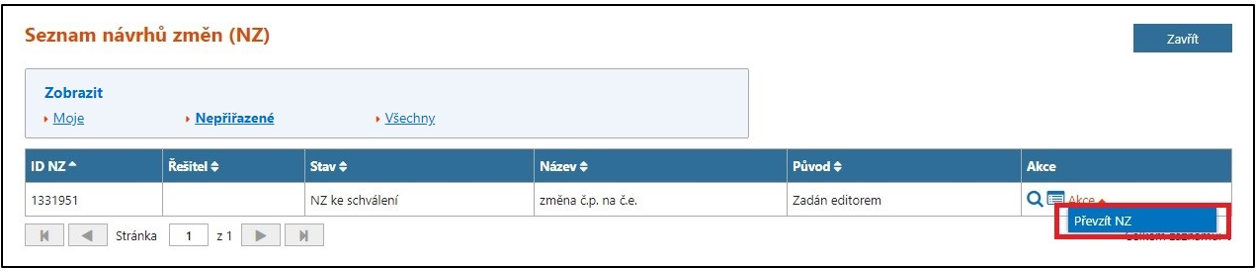 •Ze seznamu návrhů změn vyberte návrh změny, kterým se chcete zabývat a klikněte na Akce > Převzít NZ. Tím se stanete řešitelem návrhu změny a můžete pokračovat až ke schválení.