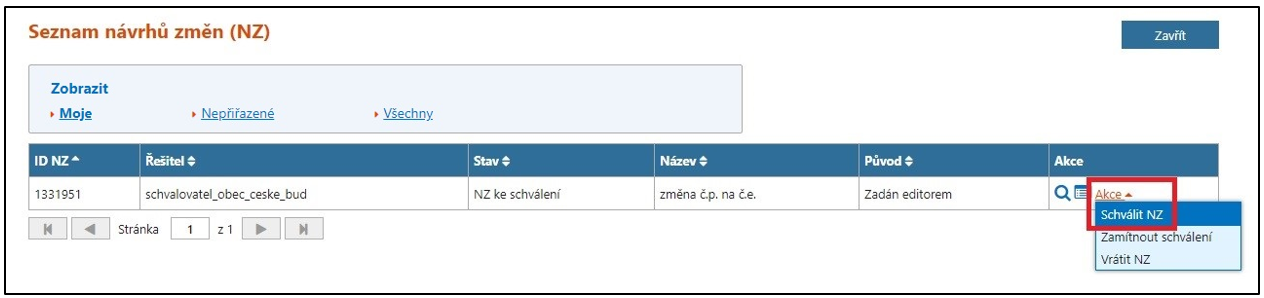 •V seznamu návrhů změn klikněte na Akce > Schválit NZ (obrazovka UWF100). Dle potřeby můžete obdobně zamítnout schválení návrhu změny (volba Zamítnout schválení) nebo návrh změny vrátit mezi nepřiřazené (volba Vrátit NZ), odkud si ho může přiřadit jiný Schvalovatel.
