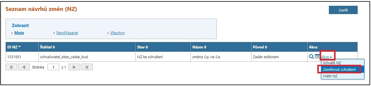•V seznamu návrhů změn klikněte na Akce > Zamítnout schválení (obrazovka UWF100).
