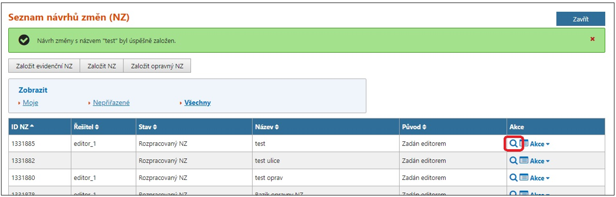 •V seznamu návrhů změn vyhledejte záznam, který jste právě založili, a klikněte na ikonu Detail.