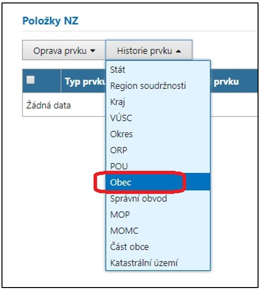 •Klikněte na tlačítko Historie prvku a zvolte Obec (obrazovka UNZ110).
