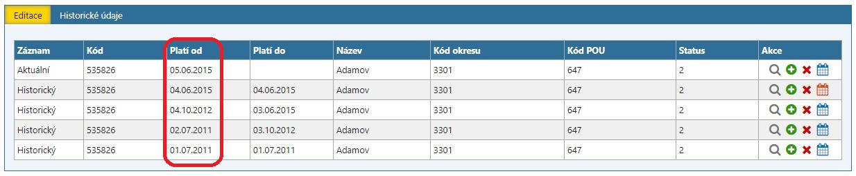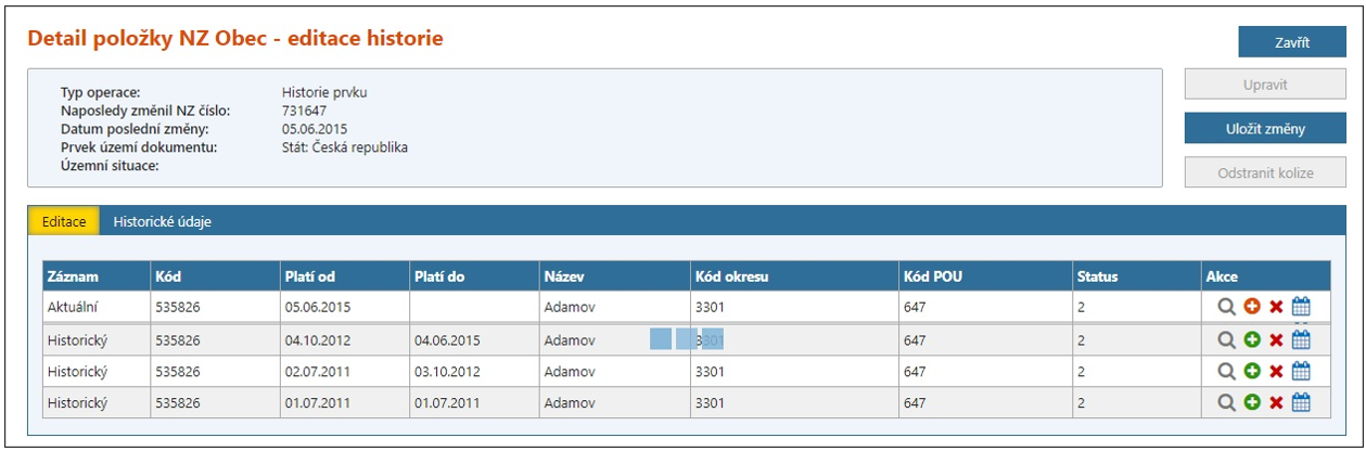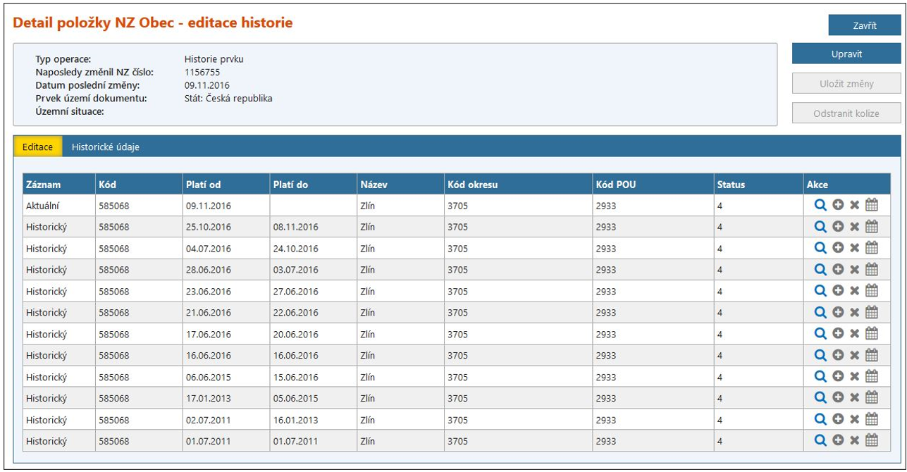 Editace historie slouží k opravě historických záznamů vzniklých po zavedení systému do provozu. Není určena ke komplexní úpravě historie v minulosti typu Gottwaldov -> Zlín.