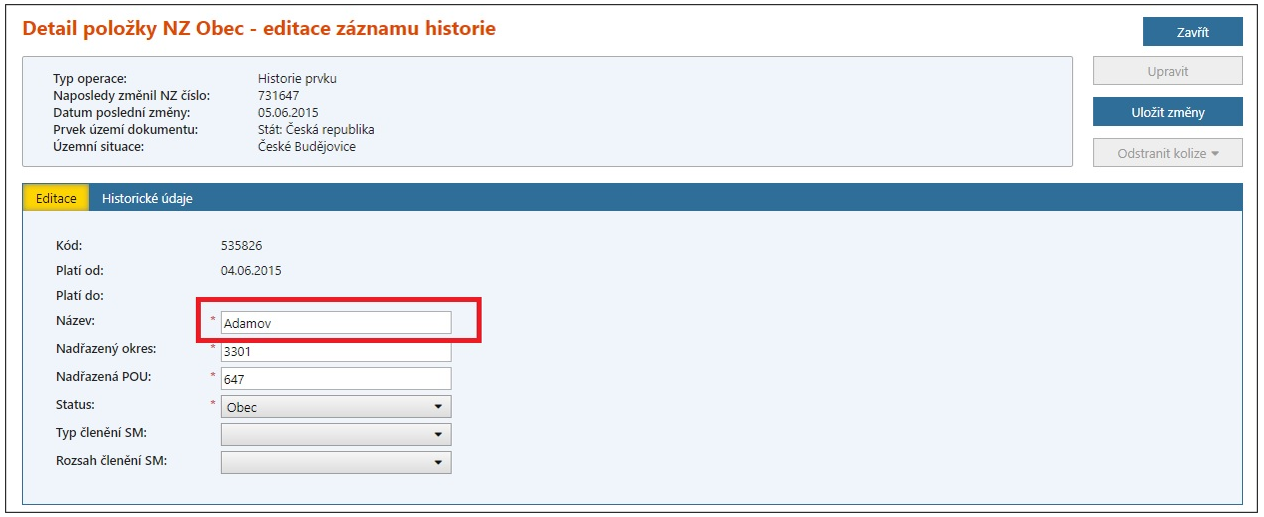 Pracujte na záložce Editace. Na záložce Historické údaje uvidíte dosud platný stav historie před Vašimi zásahy. Nemůžete zde nic měnit.