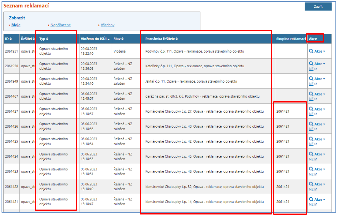 . Ze sloupce Vloženo do ISÚI je patrné, kdy byla reklamace v ISÚI vygenerovaná. Mezi sloupci Poznámka řešitele a Akce je sloupec Skupina reklamací viz kapitola Hromadné zpracování reklamací.
