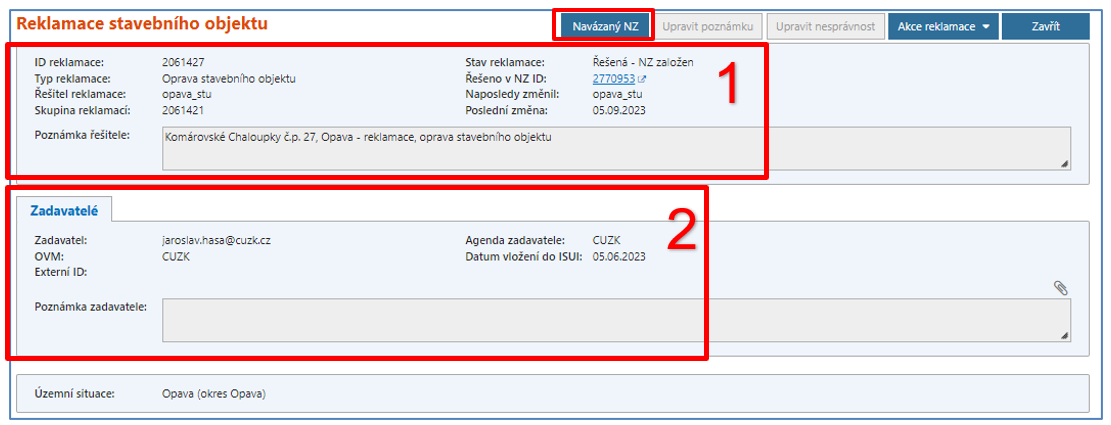 1 – V horní části jsou uvedeny základní informace o dané reklamaci, zejména ID reklamace, stav a typ reklamace, skupina reklamací, odkaz na navázaný NZ, poznámka řešitele, atribut skupina reklamací či řešitel reklamace.